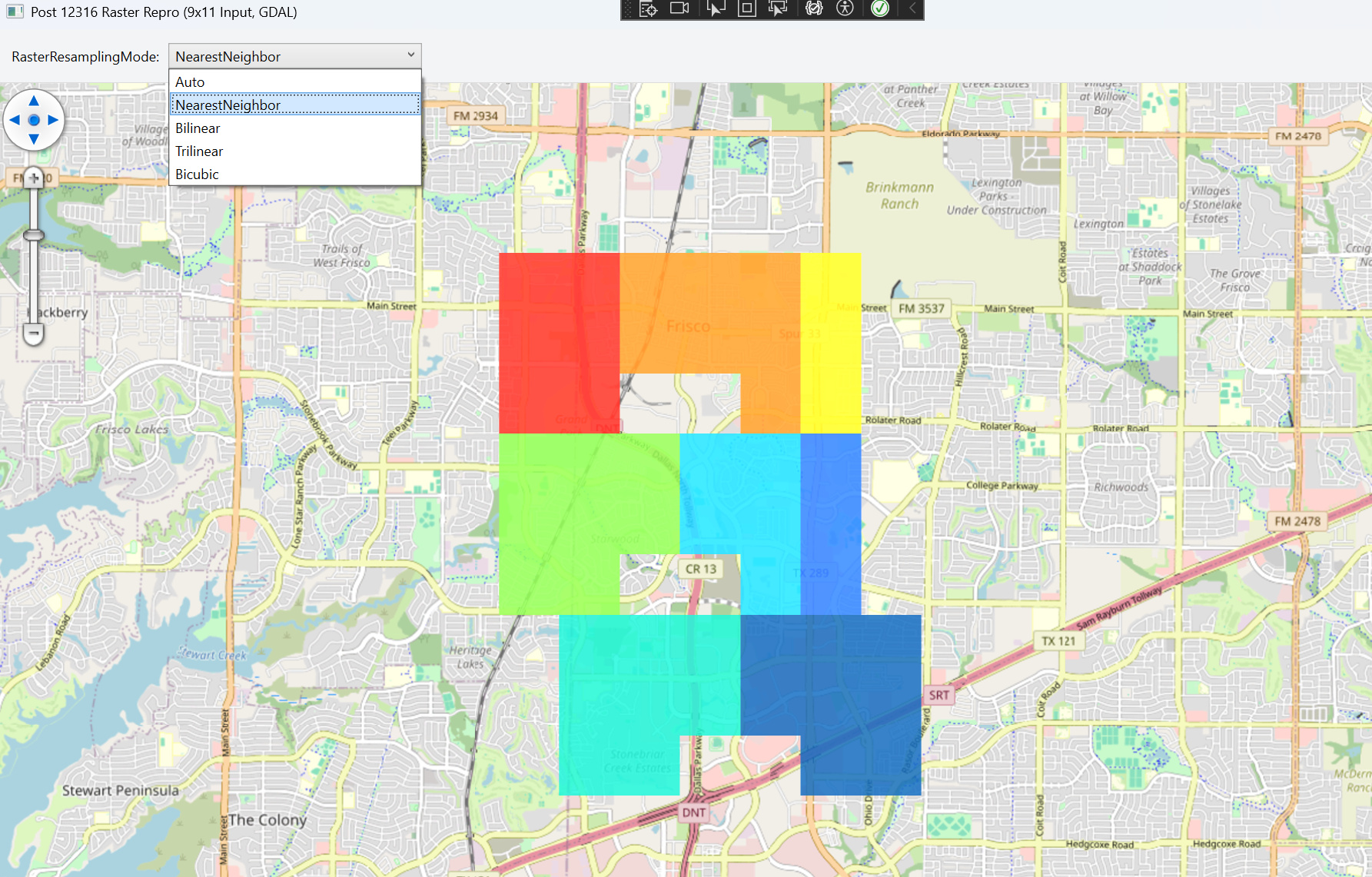 We have program generated raster data. Some of the pixels need transparency and for the rest of the pixels, we’d like to show the same color throughout the entire “cell”/“pixel”. We originally were using NativeImageRasterLayer and the transparency & colors display fine but it was interpolating between pixel centers which is undesired. I have tried switching to WpfRasterLayer but there I’m getting both interpolation and weird drawing issue near the edges of transparent areas. Any ideas on how to display these type of rasters?