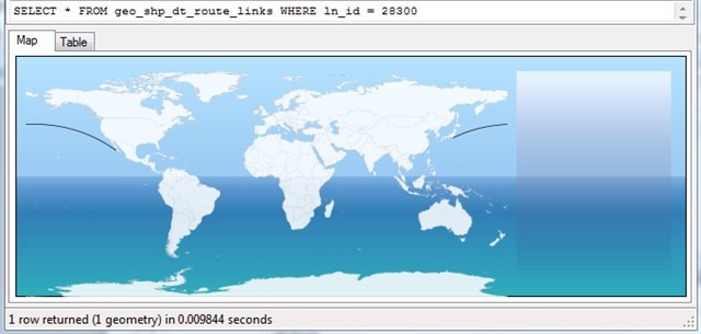 What I am endeavouring to do here is to test ThinkGeo against a table we have on our SQL 2008 server. The table consists of a very tiny subset (47,000 rows) of our Marine shipping route database. Each record simply represents a polyline from one location to another, these are in spheric geometry format rather than Planar. Thus a Pacific record is something like Geography::STGeomFromText('LINESTRING(-112.7 24.7,139.4 34.2)’,4236) which represents a line from West to East crossing the 180 meridian.