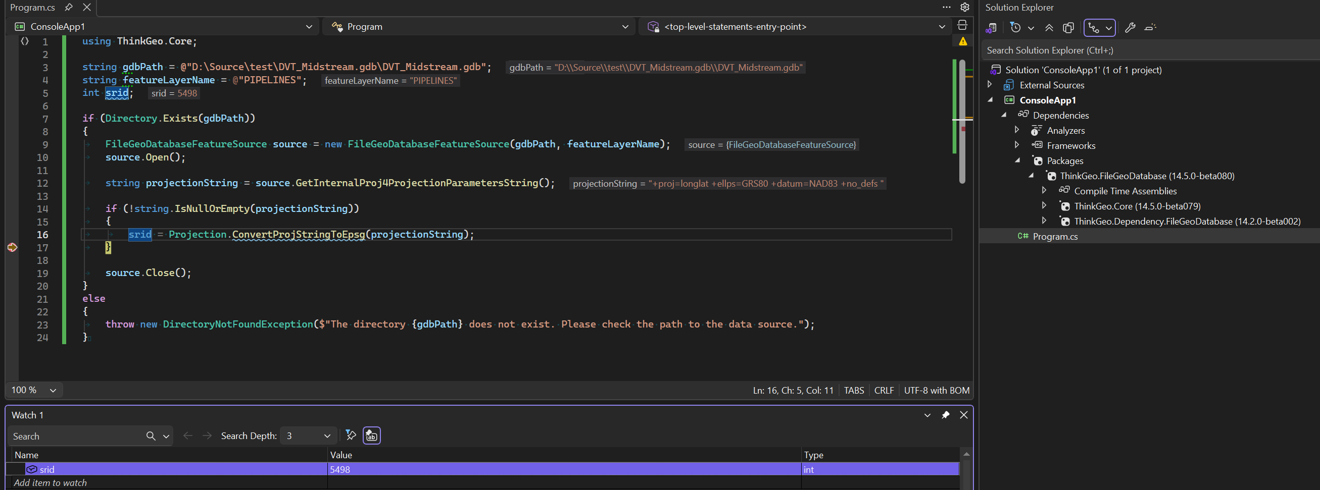 Is there a way to open a GeoDatabase in ThinkGeo and get the SRID of a specific table?